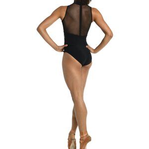 Mock turtleneck tank leotard has center front keyhole detailing. Leotard offers a sheer back and invisible zipper. Comes with Removable Bra Pads.
