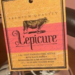 L'epicure Stainless Steel Kettle NWT Brand new tea kettle, stainless steel with covered handle. 50oz capacity with 3 venting holes in lid. Lid completely detaches. For use on gas, electric and induction stove tops. Hand wash only.
