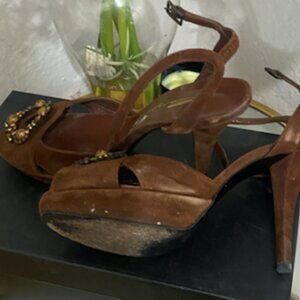Used with box. Women size 38.5 brown suede 1" platform sandals with circle multicolor stone ornament on top.