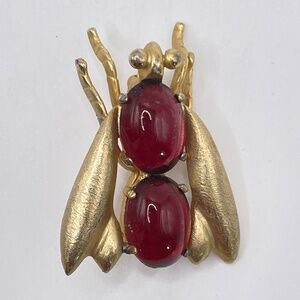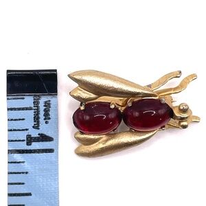Les Bernard Inc. Vintage Gold Tone Red Cabochon Fly Pin Brooch 60's
