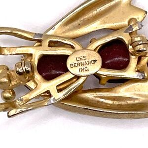 Les Bernard Inc. signed vintage gold tone and red cabochon fly pin brooch -- 1960's I think. Two purple toned red cabochons are the fly's body. Textured gold tone wings and head. Clasp works fine. Slight wear to the finish on the back in spots -- see photos. Signed Les Bernard Inc. Pre-owned. Eye catching -- or is that fly catching!?