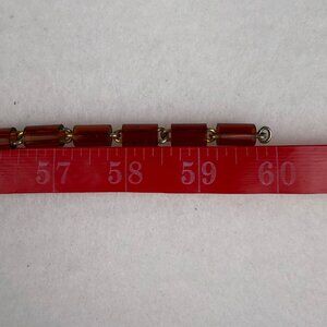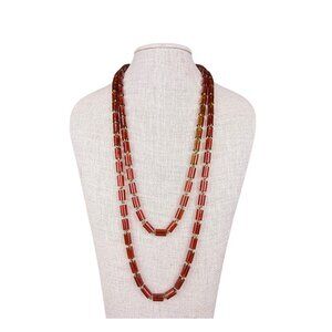 A splendid vintage treasure, this Les Bernard necklace showcases the craftsmanship and elegance that defines timeless jewelry. Featuring cylinder-shaped beads in warm amber tones, this piece exudes a refined and understated charm. The necklace includes a secure gold-tone barrel clasp stamped with "Les Bernard INC.," a hallmark of quality and attention to detail. Its elongated design allows for versatile wear, whether as a double strand or a cascading single layer. Les Bernard, renowned for creating distinctive and luxurious pieces, delivers exceptional artistry in this statement accessory. The beads' translucent quality beautifully catches the light, while their rich hue complements various wardrobes. Whether a collector's addition or a touch of classic sophistication, this piece remains both elegant and enduring.