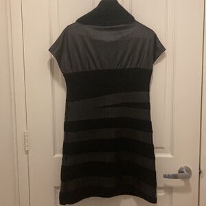 Les copains black knit mini dress with high cowl neck and cap sleeve. Alternate stripe pattern shiny/matte. Ribbed high cowl neck, faux leather upper top and sleeves. Pullover head shift silhouette. Excellent preowned condition. Made in Italy.