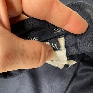 Les Copains Blue Suit Pants and Jacket 42. Preowned and in great condition. Blue suit with pants and jacket included. Pants are flat front and jacket has three button closure with tab at neck and flap on back. Approx measurements in photos.