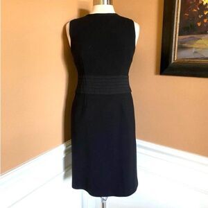 Features: sleeveless, hidden back zip, fully lined, 100% wool, fully lined, back slit, satin like pleat waist detail, classic, timeless, quality made, designer, luxury, office to dinner, church, party, cocktail, versatile, wardrobe staple, celeb style