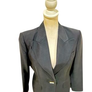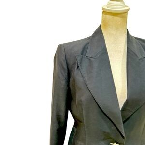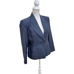 Les Copains made in Italy navy blue blazer jacket. Lined. Overstitching. Lightweight. Luxury. Single button. Front flap pockets. Likely a fine wool blend but can’t read tag. A little discoloration on back collar. Euc size eu 46