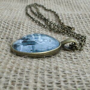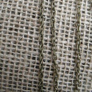 Les Miserables glass cabochon necklace. Bronze color metal. Clear glass cabochon over picture. Design is a sweeping girl from Les Miserables. Pendant is 1 inch in diameter, and 1 3/8 inches high with bail. It's on an 19 inch long chain. Textured design on backside. Brand new item from my local shop. For women or men. Great for anyone who likes unique jewelry and/or Les Miserables.