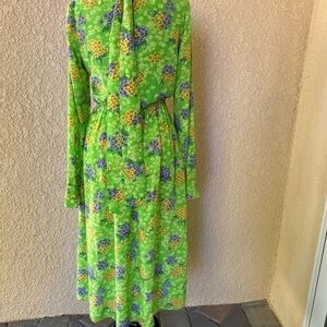 Les Reveries Silk Lime Green With Purple & Gold Floral Print Midi Dress 6 EUC