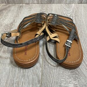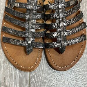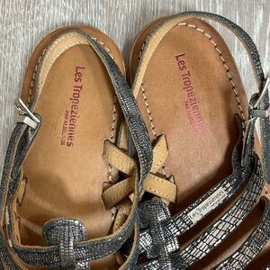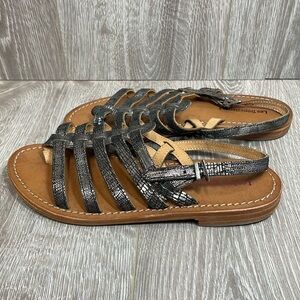 Les Tropeziennes Par M.Belarbi Herisson Gladiator Sandal Leather in Size 37. Excellent preowned condition. Leather upper is black and silver with silver tone accents, leather lining, adjustable buckle ankle strap, rubber heel. Please see photos for details. Item may show difference in color based upon photography and perception. Photos are part of the description, as everyone’s level of condition may vary. From smoke free and pet free home. All packages are shipped the same or next business day.