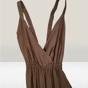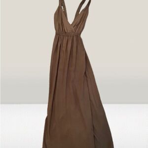 This elegant khaki maxi sundress boasts a chic plunge neckline and a sleeveless design, making it a perfect choice for resort wear. Its flowing silhouette and lightweight fabric ensure comfort and style in warm weather, while the relaxed fit adds a touch of breezy sophistication.