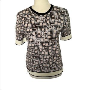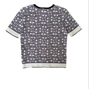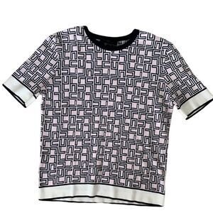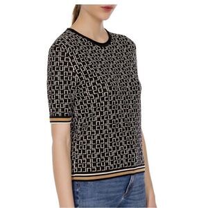 Virgin wool pullover top with allover jacquard-knit logos and contrast rib trim.
