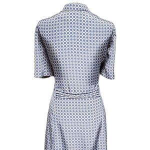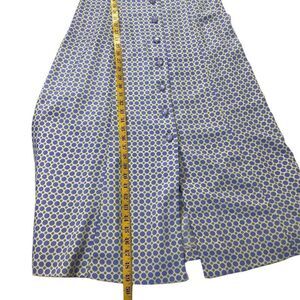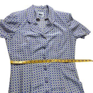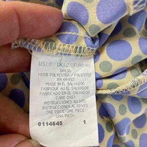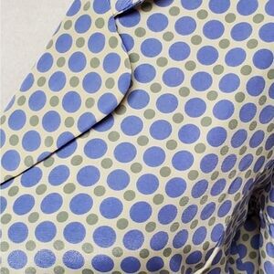 This is a vintage Leslie Fay full button up summer dress with short sleeves. It’s made from a polyester that is light and flowy. It’s a corn flower blue and olive green polka dot pattern. Wear it with sneakers or sandals. It’s so feminine and flowy.