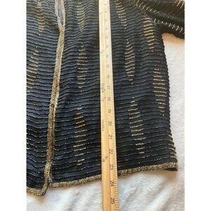 Elegant open-front evening jacket with intricate beaded detailing, offering a glamorous touch to any outfit.,Very good condition, 100% SIlk , shoulder pads, Tags says Medium but should fit up to Large see measurements
