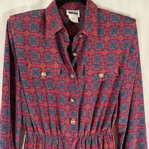 Leslie Fay Midi Dress Women's 8 Petite Red Blue Long Sleeve Collared Pleated