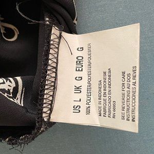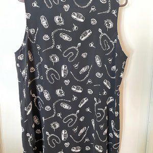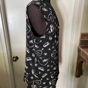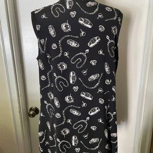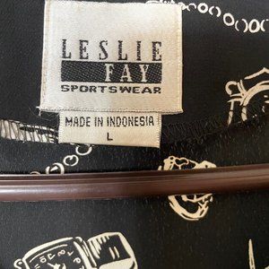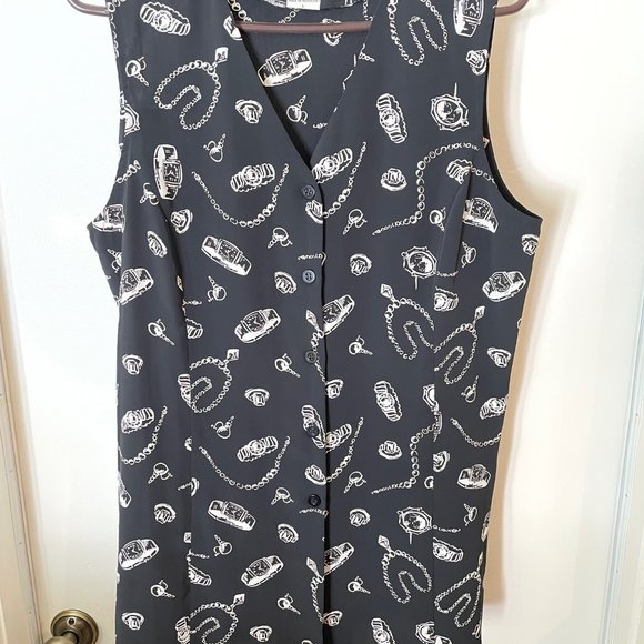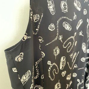 This Leslie Fay Sportswear Vest Size is a size Large. It has a Black Background with Cream Images of Jewelry. This fun vest can be worn buttoned up or unbuttoned over a dress or top and pants. 100% Polyester and you are able to Machine Wash and Tumble Dry.