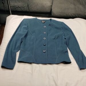 Stylish bluish green button-up jacket perfect for any occasion. Features a sleek design with comfortable fit. There is a small mark on the left sleeve