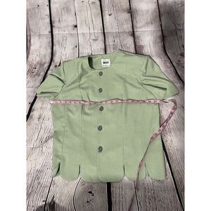 Elevate your wardrobe with this stunning Leslie Fay vintage 3-piece set in a gorgeous green color. The set includes a skirt, blazer, and scarf all adorned with beautiful button-up details. Perfect for any occasion, this set exudes classic sophistication and style.