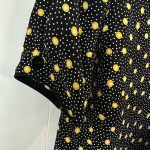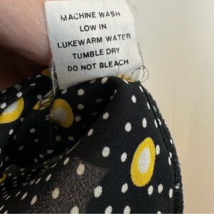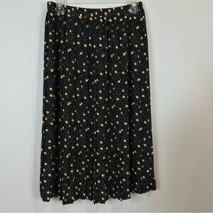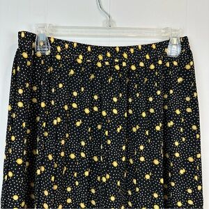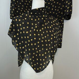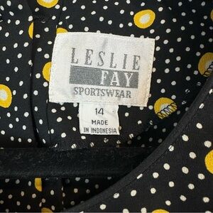 Vintage 1980s Leslie Faye 3-piece skirt set, women’s size 14. Black with yellow polka dots. Includes pleated skirt, short-sleeve blouse, and matching scarf. Classic 80s silhouette with lightweight fabric. Excellent vintage condition.