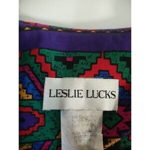 Vintage Leslie Lucks blouse jacket featuring a unique Southwest Aztec design. Medium size with a stylish collar and button-up front. Perfect for adding a touch of retro flair to any outfit.