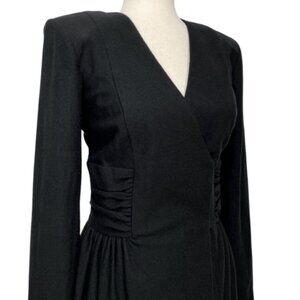 Leslie Lucks Vintage 80s Wool Blend Black Faux Wrap Midi Dress Size 12