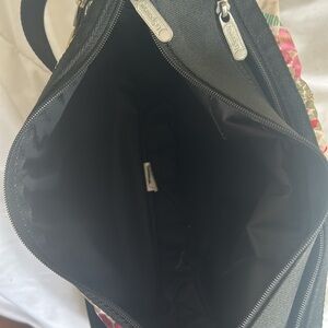 This Lesportsac shoulder bag showcases a sleek black and cream floral color scheme, providing a stylish and versatile accessory for any occasion. Its structured design ensures both durability and elegance, making it an ideal choice for everyday use. The bag's sophisticated look effortlessly complements a variety of outfits, from casual to formal. Hundred percent polyester. The wording on the outside of the bag is a little worn on one side.