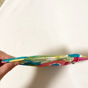 Medium sized, nylon zip pouch in all-over colorful daisy print with pink logo banded detail at top. Unlined.