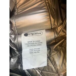 Lightweight black ripstop nylon weekender with dual top handles and detachable adjustable shoulder strap. Exterior zip pocket with LeSportsac logo tape; soft-structure packable design—great as carry-on or gym/overnight bag.