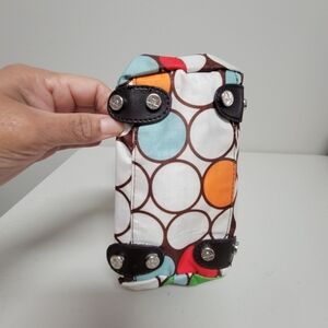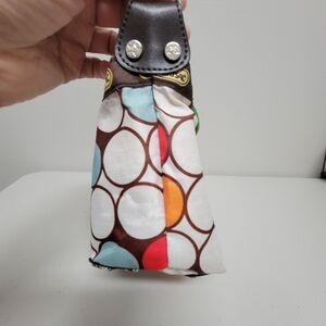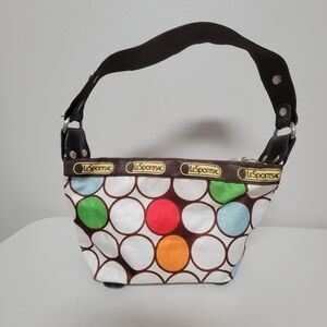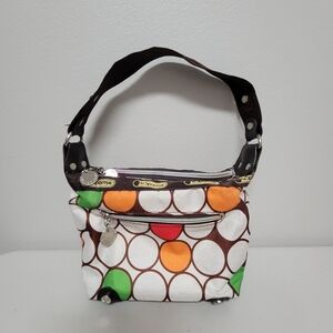 This Lesportsac shoulder bag combines a chic white and brown color palette with a retro-inspired geometric pattern, making it a standout accessory.