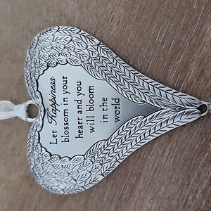 Design: Heart-shaped ornament wrapped in detailed angel wings with an uplifting sentiment: “Let Happiness blossom in your heart and you will bloom in the world.”
