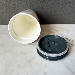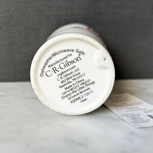 Let It Snow! travel mug by CR Gibson. Ceramic mug is double-walled with plastic lid. Holds 12 oz. Measures 3-1/2" across the top, 2-5/8" across the bottom and is 5-1/4" high. Microwave and dishwasher safe.