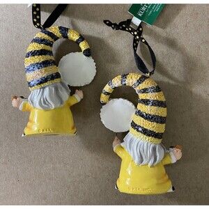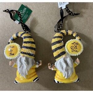 Super cute honey bee themed Gnomes are all about saving the bees Bright yellow with black accents Measure 4 inches high Not Christmas themed so could be displayed all year long Set of 2 Includes Save the Bees and Let it Bee New with tags and polka ribbons for hanging.