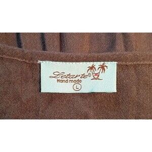 This beautiful Letarte tunic dress is a must-have for any bohemian or western-themed event. The dress features a V-neckline and long sleeves with a pullover closure, making it a comfortable and casual choice for any occasion. It features an elastic and adjustable tie at the waist. The brown color and tasseled accents add a touch of elegance to the dress, while the embroidered details and crochet edges make it truly unique. Made from lightweight woven rayon fabric, this dress is perfect for the summer, fall, or spring seasons. It is collarless and comes in a short length, making it ideal for a festival, beach, or hippie-inspired outfit. The dress is handmade in India and is available in size L for regular size women. Letarte is a trusted brand that creates stunning and personalized bohemian-style clothing. Pit to pit 19", length from shoulder 37".