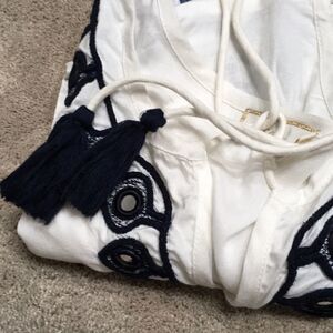 Letarte Luxe swimsuit coverup. Super soft white rayon that feels luxurious. It has embroidered navy design embellished with mirror. The style has bat wings. So it gives you some shape. Navy blue tassels on the ends of the ties and at the corners. I love this! It’s very soft and beautiful. The manikin has on a medium. It can fit multiple sizes due to the design.