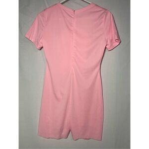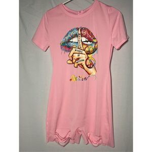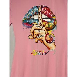 Pink romper with the words on it “whisper words of wisdom, let it be”.