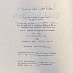 "Letourneau's Used Auto Parts," by Carolyn Chute. This 1988 first edition Ticknor & Fields paperback is in great shape. Clean pages, tight binding, no creases in spine. No marks or markings, no stickers or sticker goo. Minor shelf wear. From the author of "The Beans of Egypt, Maine." According to one product description, "Head of the Letourneau clan of Egypt, Maine, owner of the only profitable business in town, and notorious philanderer, Big Lucien presides over an assortment of oddball characters, from an aging flower child to a country music star." Another description offers, "A story about Miracle City, a squalid jumble of unpainted shacks and trailers that is nonetheless a welcome haven to the residents of this poverty-stricken community. The area's most important citizen is the eponymous Big Lucien Letourneau, who runs the auto salvage junkyard at which most of the men work. It's a brutal life. There are times when Lucien can't afford to pay his men but he does have a heart fo gold. He is said to be a one-man welfare system, sheltering the destitute, homeless and elderly."