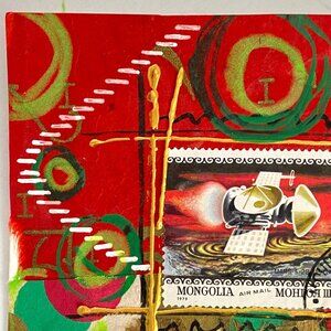 It features an interesting vintage 1979 Mongolia postage stamp with a satellite image. Exotic papers, acrylic paints, markers, wax pastels and oil pastels in colors of red, green, orange, black, white and gold are combined in this exotic painting.