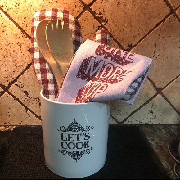 Ceramic utensil holder, wooden utensils, 2 decorative kitchen towels and 1 decorative oven mitten. Great gift idea.