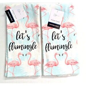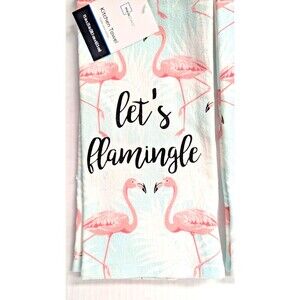 Let's Flamingle Kitchen Towels Flamingo 2-Pc Tropical Pink Blue White Gift NWT