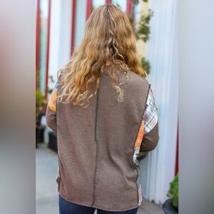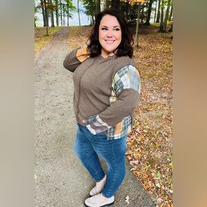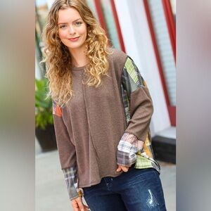 Made with a corded brushed Hacci and a French terry plaid patchwork color block, this round neck top with outseam overlock stitching is perfect to cozy up in.