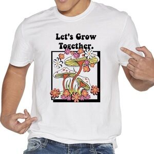 this groovy tee features a colorful mushrooms graphic & graphic reads 'let's grow together'