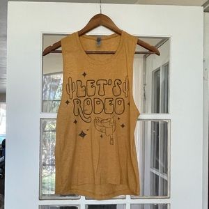 Super cute “Let’s Rodeo” graphic tank in a mustard yellow color. In excellent pre-loved condition. Size small, fits true to size!