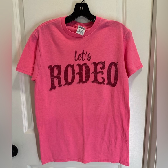 Brighten up your wardrobe with this vibrant pink 'Let's Rodeo' t-shirt. Perfect for casual outings.