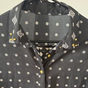 Stylish sheer black blouse with polka dot pattern. Features button-up front and long sleeves. 19.5” put to pit