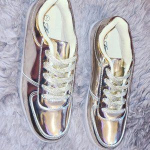 Lets get our SHINE ON! Mirror Gold Flat Forever Tennis Shoes with the Glitter Metallic Laces. Brand New never worn with no tags. Ready to ship before the Holidays. Smoke Free Home. I have a Size 7 Never Worn. Ready to ship from clean and smoke free home.