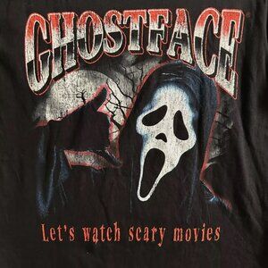 Kid friendly design! High-quality Ghostface "Let's Watch Scary Movies" t-shirt in size medium. Featuring the iconic legend of the '90s SCREAM movie franchise, this shirt boasts vibrant colors with a puff print and is not a silk print or reprint. Hilarious design of Ghostface with his hand up to call him to hang. The design looks vintage with a cracking effect - very 2000s! Has a full moon in the background and Halloween feel with a bare/barren fall spooky tree with gnarled, twisted branches that contribute to the eerie atmosphere.