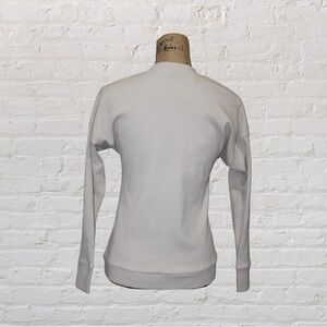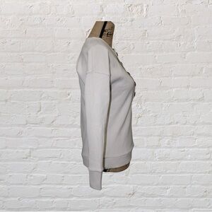 Henley style top by Lett. Beige ribbed shirt. Drop Shoulder. Color - Ecru. Hand wash, dry flat. 47% modal, 47% cotton, 6% spandex. Approximate measurements: 19" pit to pit 25" shoulder to hem 18" shoulder to cuff.