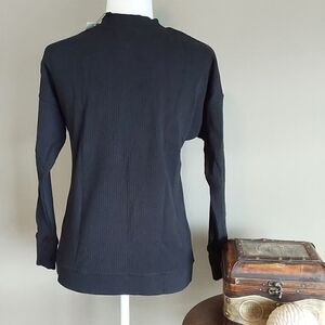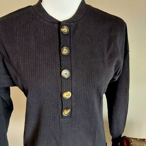 Elevate your wardrobe with this Lett Kruger Henley Top in classic black. Crafted from a comfortable cotton/modal/spandex blend, this top features a ribbed texture and a relaxed fit for all-day wear. The long-sleeved top showcases a classic/fitted sleeve type, accented with buttons for added style. Its Henley neckline adds a touch of sophistication to its basic style, making it perfect for any occasion.