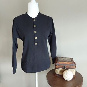 Ideal for women in search of a basic but trendy top, this Lett Kruger Henley Top in black is available in size XS. It is solid in pattern, with no vintage indications, making it a modern and versatile piece. This button-up top is suitable for any casual or formal occasion, thanks to its classic theme.