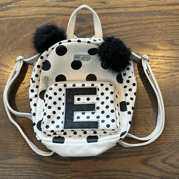 Justice brand girls mini school backpack with black letter “E”. In excellent used condition.