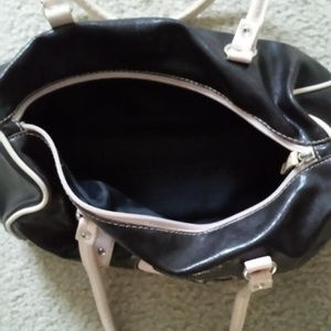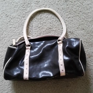Black roomy purse with the letter "G" in the middle in pink along with pink riveted columns connected to pink handles. Very popular a few years ago. Approximately 13 inches by 7 inches by 5 inches.